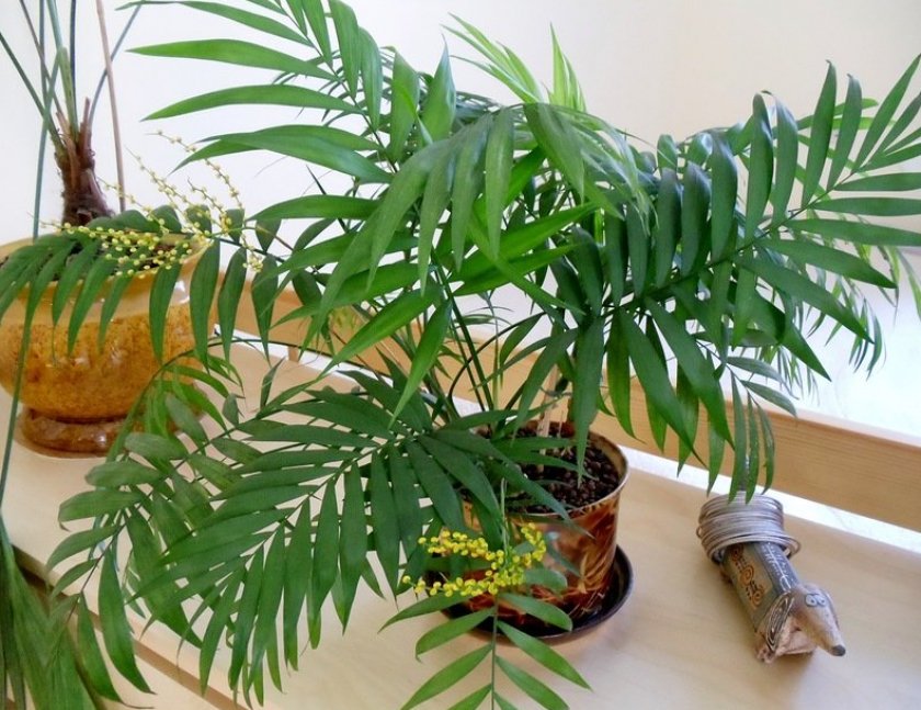 Хамедорея способна цвести круглый год. Если вам нравятся её скромные соцветия-метёлки, можете их оставлять. Многие цветоводы удаляют завязи, чтобы они, по их мнению, не портили внешний вид цветка.